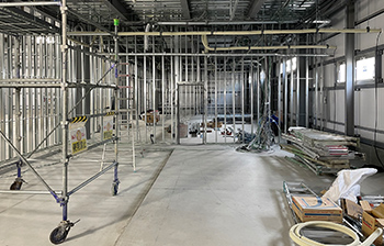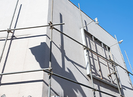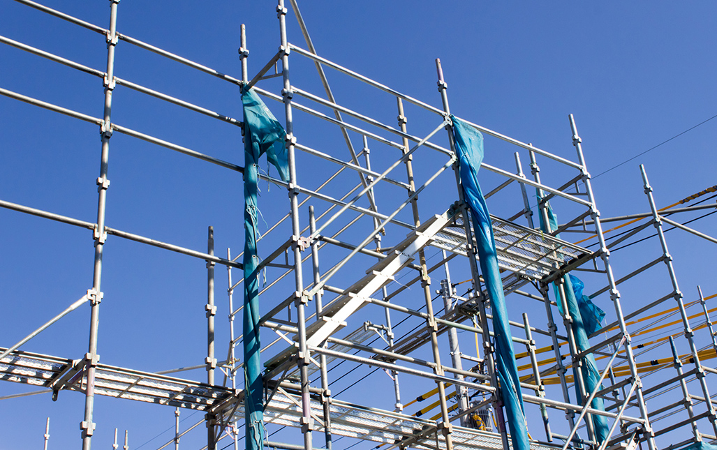 大型の看板を高所に設置するときに使用される看板足場。建物全体を囲むのではなく、部分的に設置することで、規模を縮小し安全に作業していただけます。