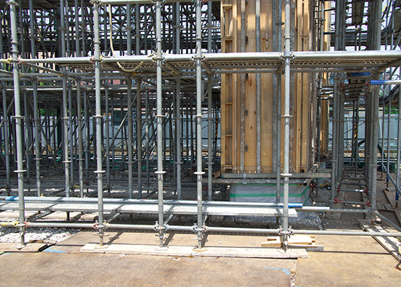 大型の看板を高所に設置するときに使用される看板足場。建物全体を囲むのではなく、部分的に設置することで、規模を縮小し安全に作業していただけます。